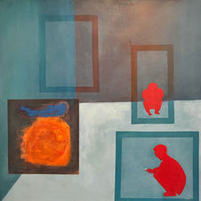 This work stages a psychological space where inner tensions simmer beneath the surface. The red geometry encloses and isolates, while the two grounded organic forms hint at something primal - gestures of suffering, emergence, or regression.